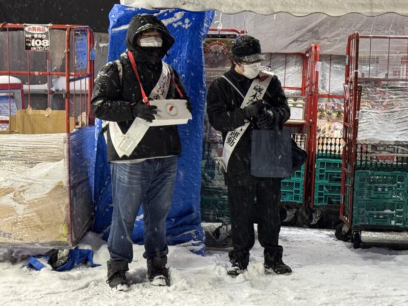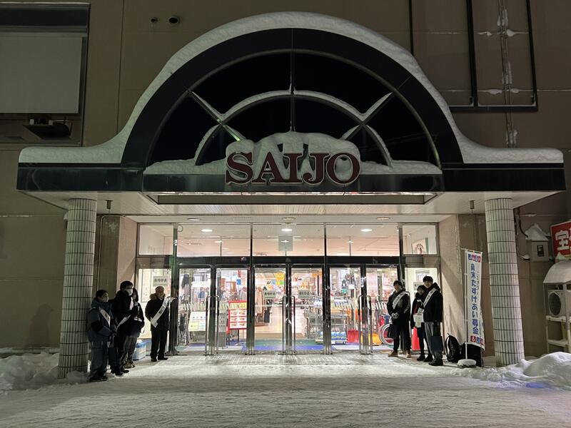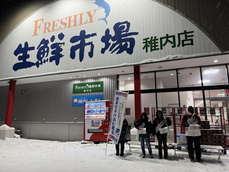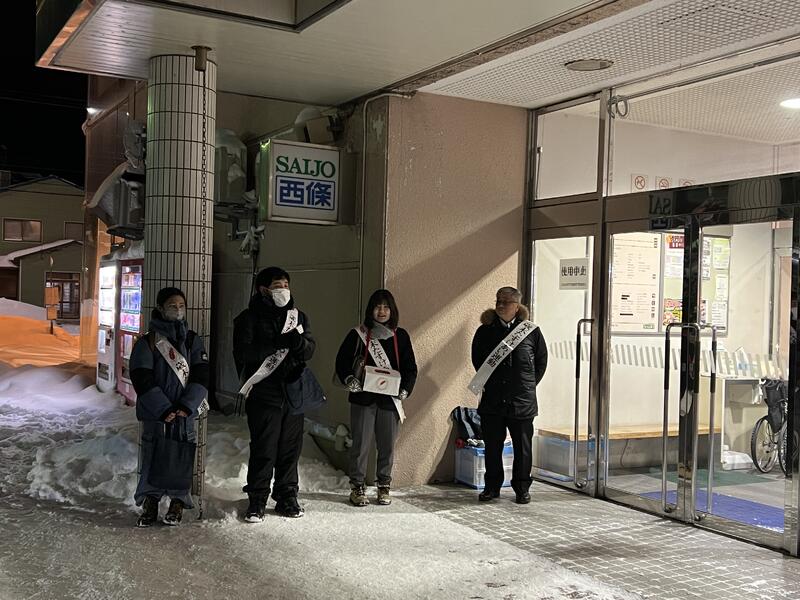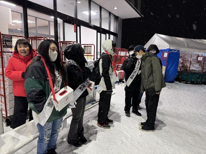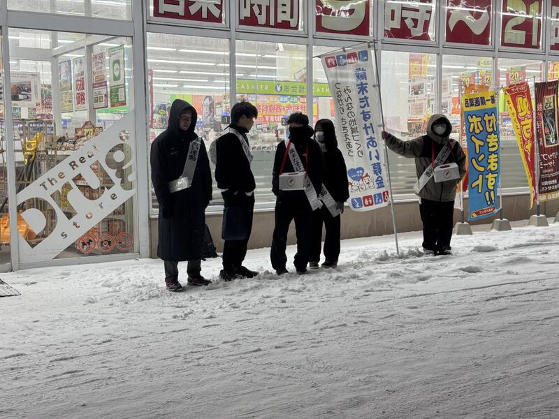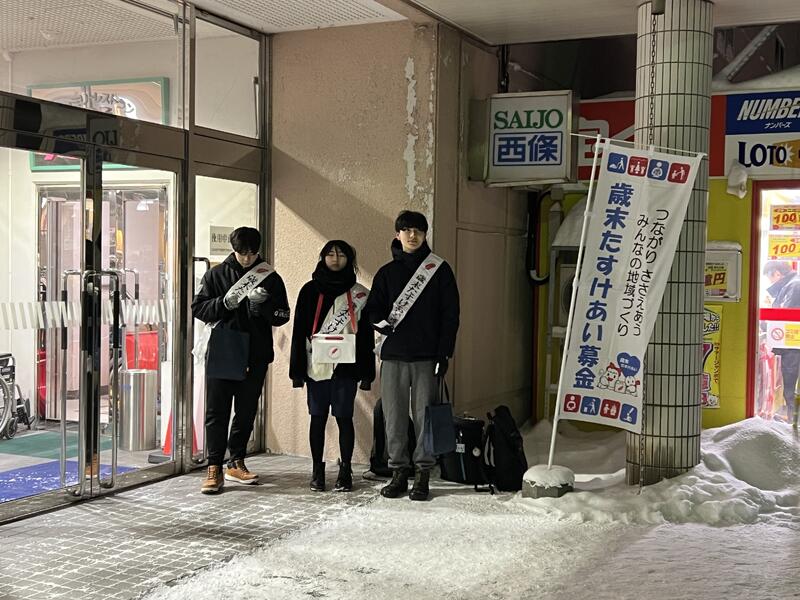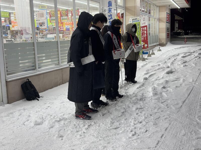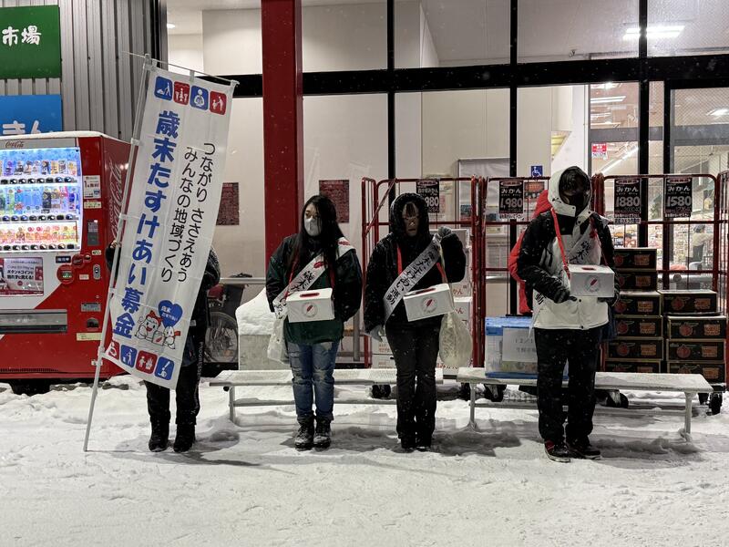 雪が降り積もる厳しい寒さの中、12月13日(金)に社会福祉協議会主催「歳末助け合い募金活動」に参加させていただきました。市内の商業施設4カ所にご協力いただいて、来店される方々に募金のご協力を呼びかけ、募金いただいた方へ配布物を手渡すなど、生徒はそれぞれ与えられた役割をしっかりと果たしていました。今年も大変多くの地域の方々にご協力いただくことができ、また活動への労いのお言葉もいただくことができました。