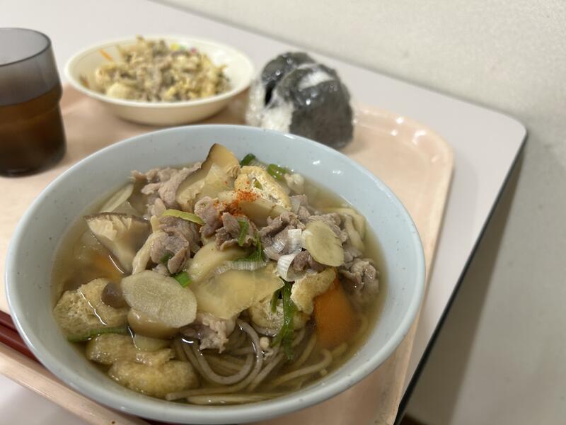 今日のメニューは、「けんちんそば」、「豚肉と豆腐炒め」、「おにぎり」でした。