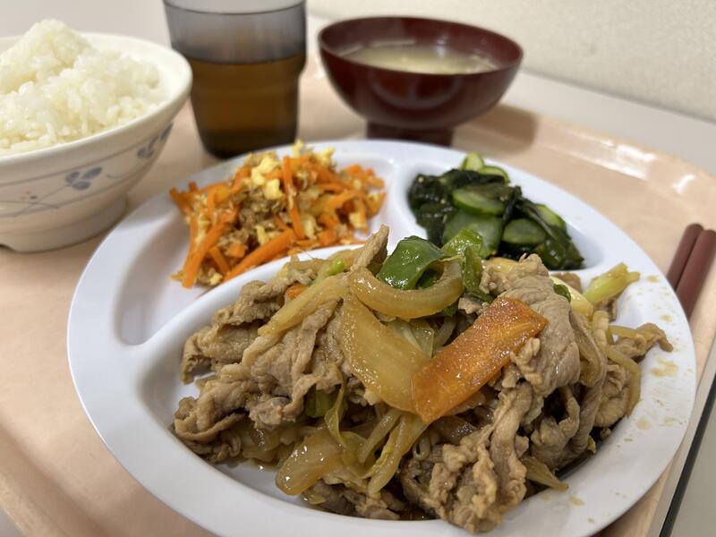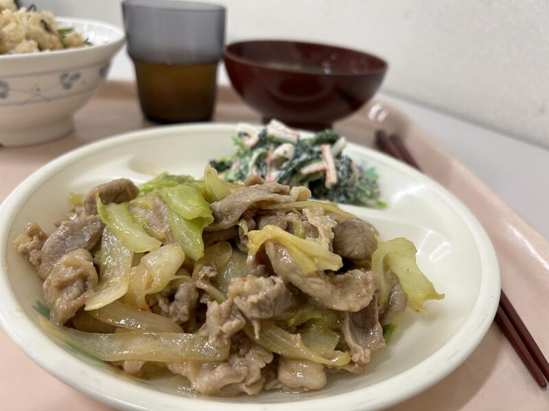 今日のメニューは、「豚肉の生姜焼き」、「キャベツの煮びたし」、「サラダ」、さつまいも・油揚げ・玉ネギの「味噌汁」でした。今日もおいしくいただきました。