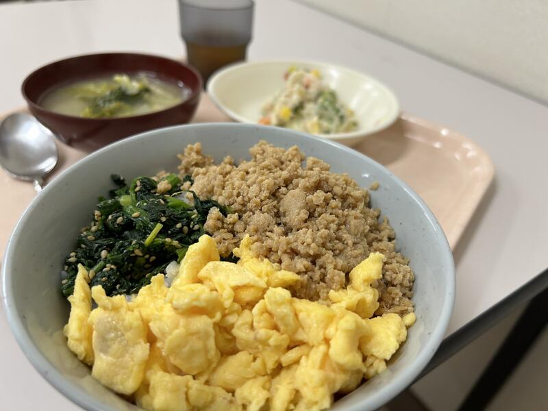 今日のメニューは、「三色丼」、「ササミと人参サラダ」、「ワカメスープ」でした。