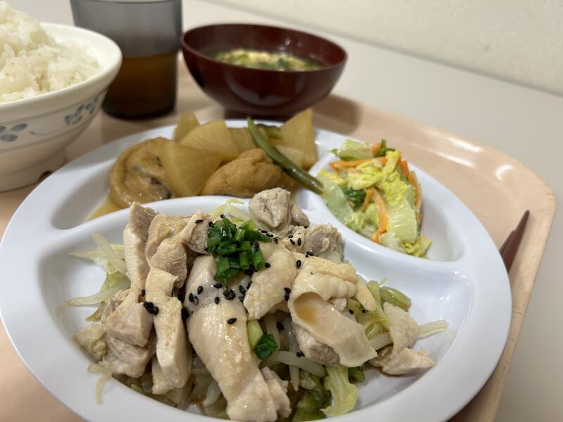 今日のメニューは、「茹でとりのポン酢かけ」、「大根とがんもの煮物」、「和風マヨサラダ」、「卵スープ」でした。今日もおいしくいただきました。