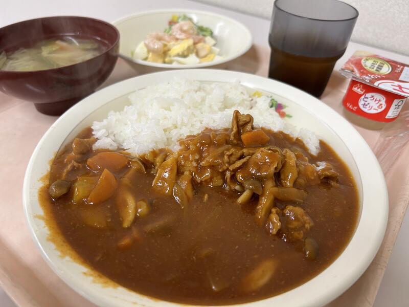 今日のメニューは、「カレーライス」、「マカロニサラダ」、デザートの「ゼリー」でした。