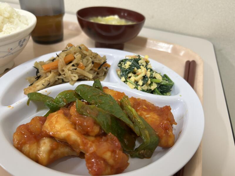 今日のメニューは、「ポークチャップ」、「大根そぼろ煮」、「和ドレサラダ」、チンゲン菜・人参・玉ネギが入った「スープ」でした。今日もおいしくいただきました。