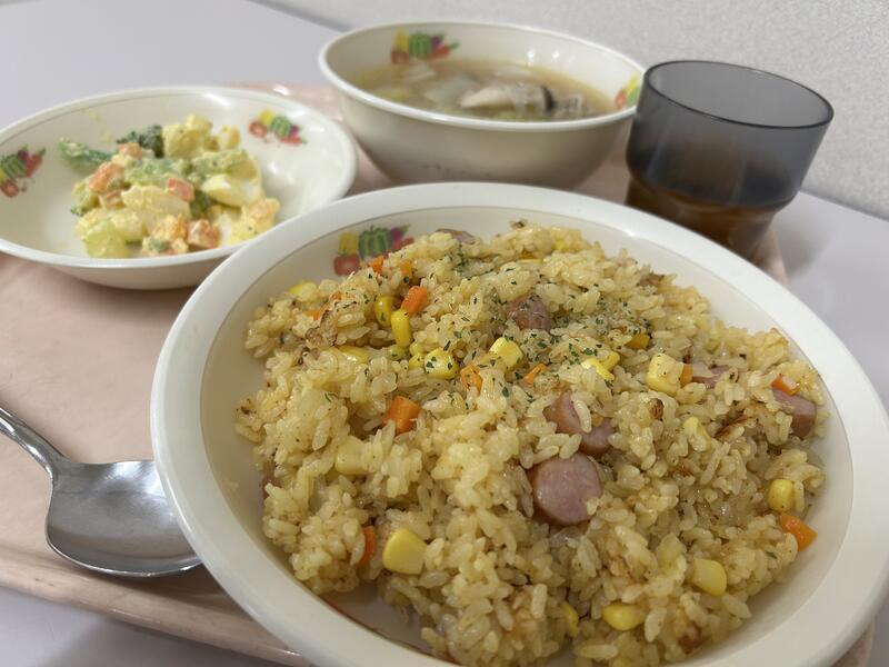 今日のメニューは、「チキンピラフ」、「スープ」、「ヨーグルト和え」でした。