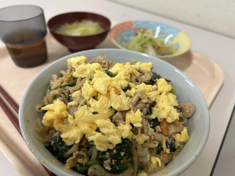 今日のメニューは、「豚丼」、「ポテトサラダ」、豚肉・キャベツ・もやし・ニラが入った「味噌スープ」でした。今日もおいしくいただきました。