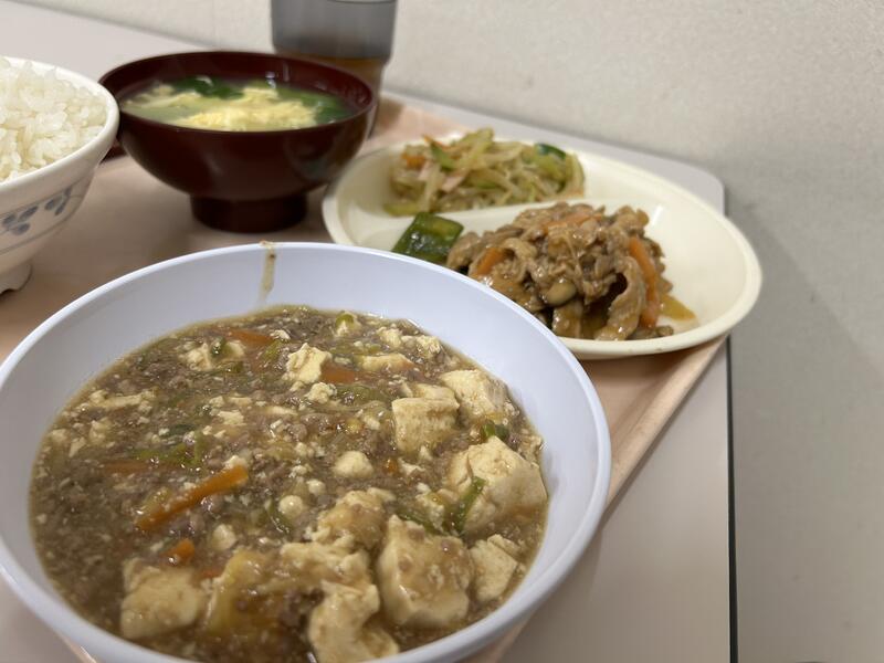 今日のメニューは、「麻婆豆腐」、「肉野菜炒め」、「中華サラダ」、チンゲン菜・玉ネギ・玉子の「スープ」でした。今日もおいしくいただきました。