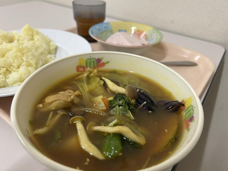 今日のメニューは、「キーマカレー」、「白菜玉子スープ」、デザートの「ヨーグルト」でした。今日もおいしくいただきました。