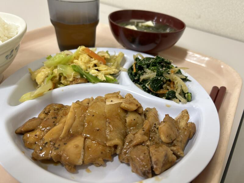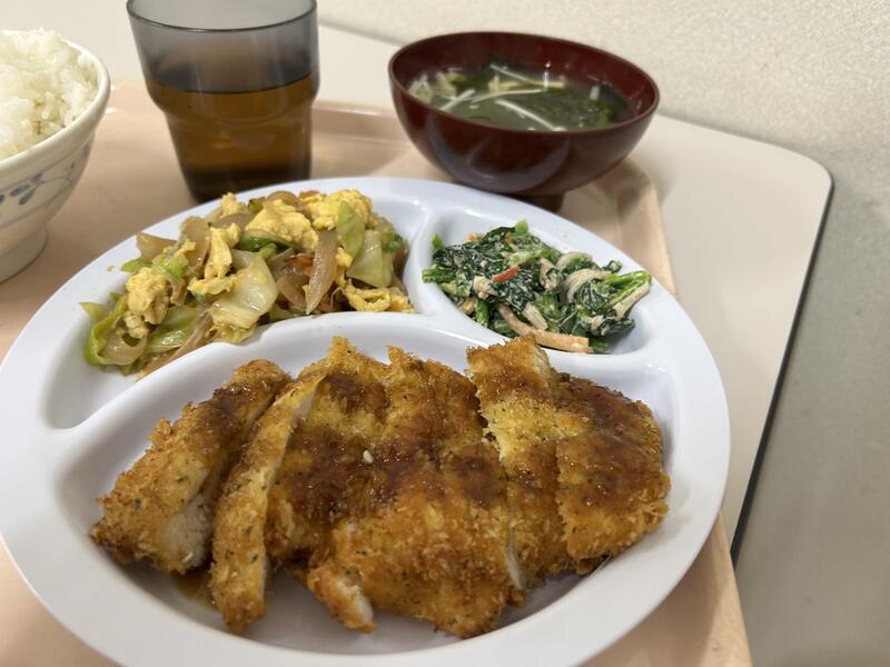 今日のメニューは、「チキンカツ」、「キャベツ炒め」、「ホーレン草和え」、ワカメ・豆腐・えのきの「味噌汁」でした。今日もおいしくいただきました。