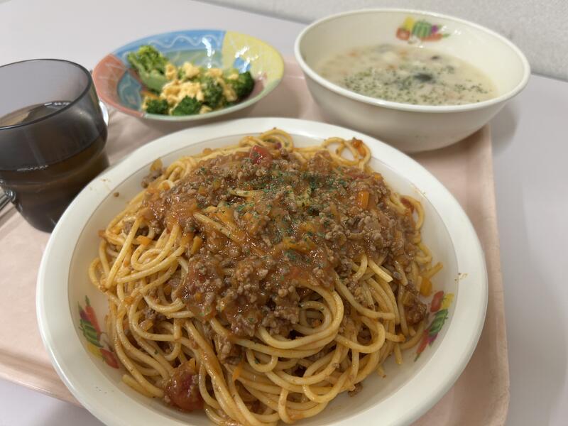 今日のメニューは、「スパゲティ・ミートソース」、「コーンスープ」、デザートの「フルーツポンチ」でした。今日もおいしくいただきました。