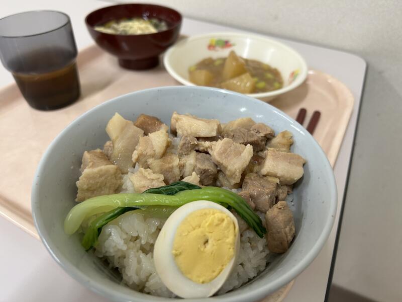 今日のメニューは、「ルーロー飯」、「大根のツナあんかけ」、小松菜・人参・まいたけ・玉子が入った「スープ」でした。今週もおいしくいただきました。