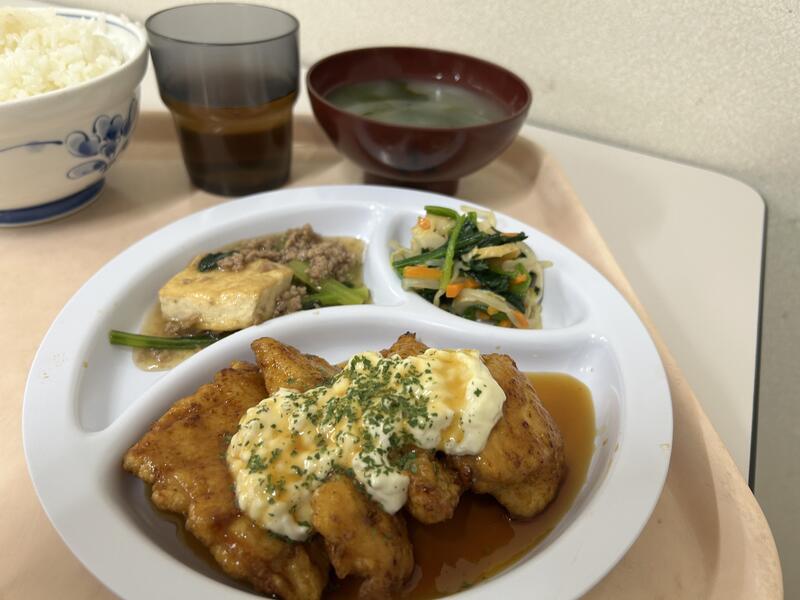 今日のメニューは、「チキン南蛮」、「豆腐のひき肉あん」、「人参サラダ」、じゃがいも・ワカメ・玉ネギ・ごぼうが入った「味噌汁」でした。今日もおいしくいただきました。