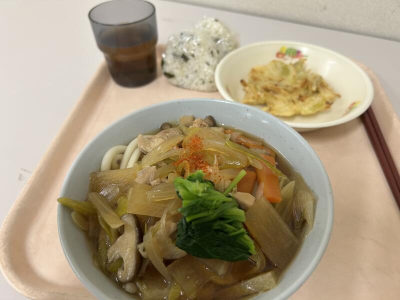 今日のメニューは、「肉うどん」、「かき揚げ」、「おにぎり」でした。