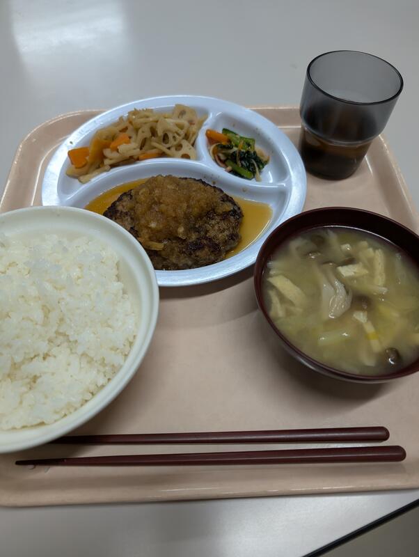 今日のメニューは、「おろしソースハンバーグ」、「れんこん金平」、「小松菜ごま和え」、「味噌汁」でした。今日もおいしくいただきました。