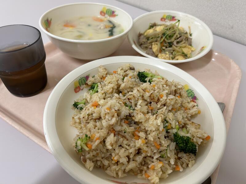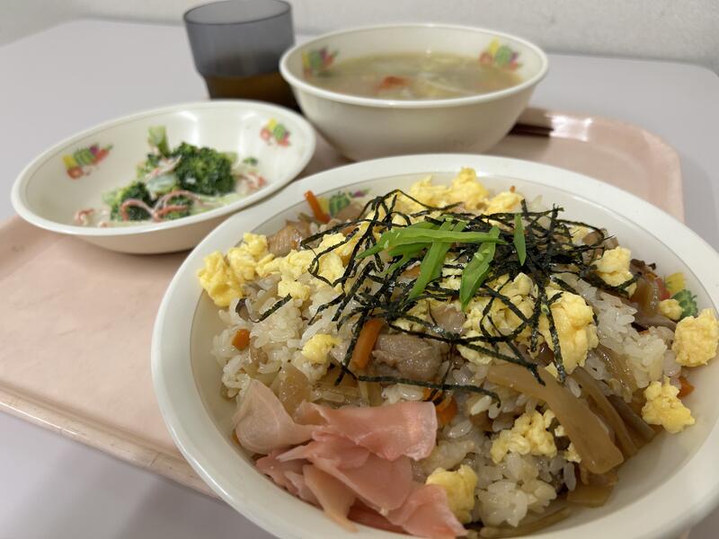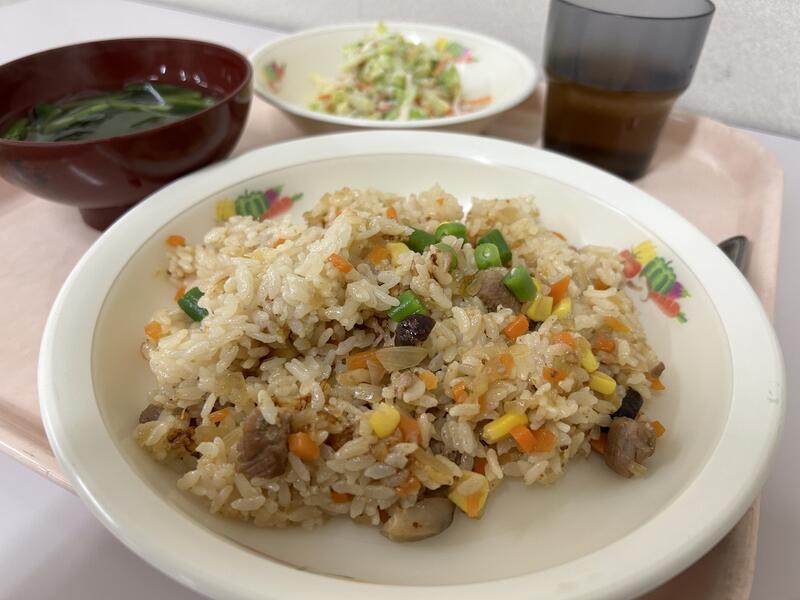 今日のメニューは、「焼豚チャーハン」、「キャベツカニカマ和え」、「中華スープ」でした。今日もおいしくいただきました。