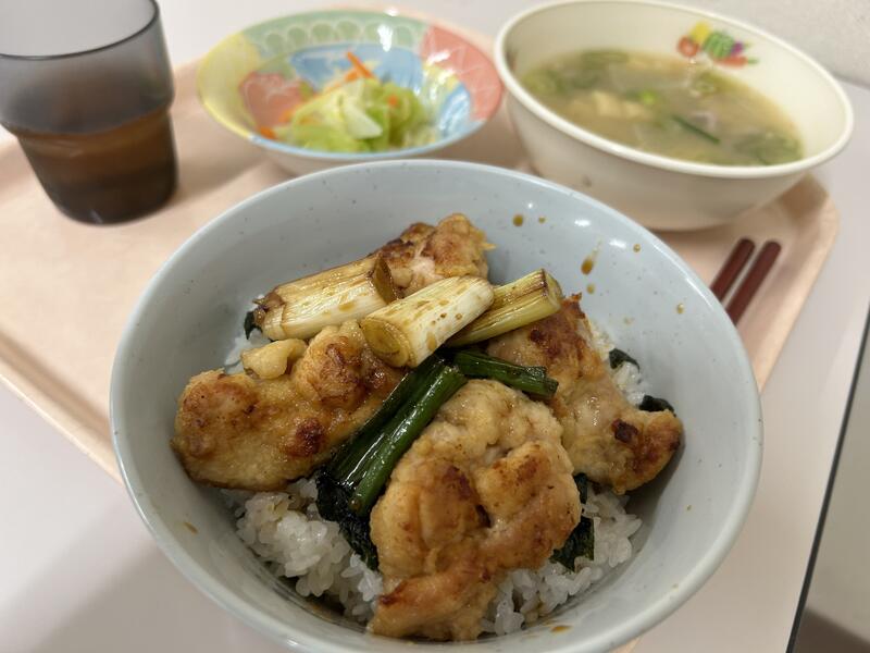 今日のメニューは、「焼き鶏丼」、「さつま汁」、「サラダ」でした。