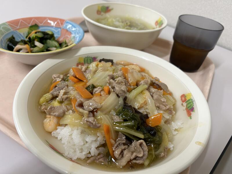 今日のメニューは、「中華丼」、「きゅうりのポン酢和え」、「中華スープ」でした。