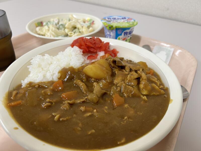 今日のメニューは、「カレーライス」、「マカロニサラダ」、デザートの「ヨーグルト」でした。今日もおいしくいただきました。