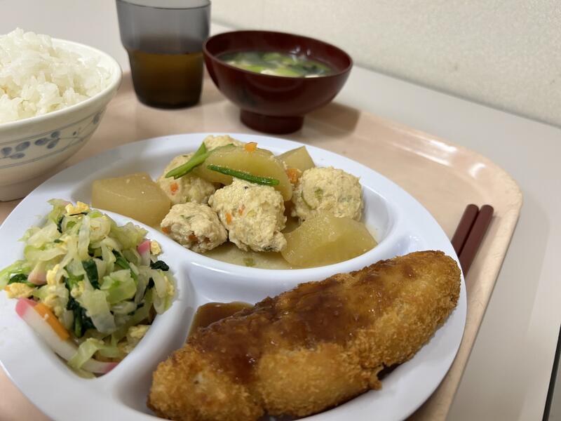 今日のメニューは、「白身魚フライ」、「鶏団子と大根煮」、「五色和え」、小松菜・豆腐の「味噌汁」でした。今日もおいしくいただきました。