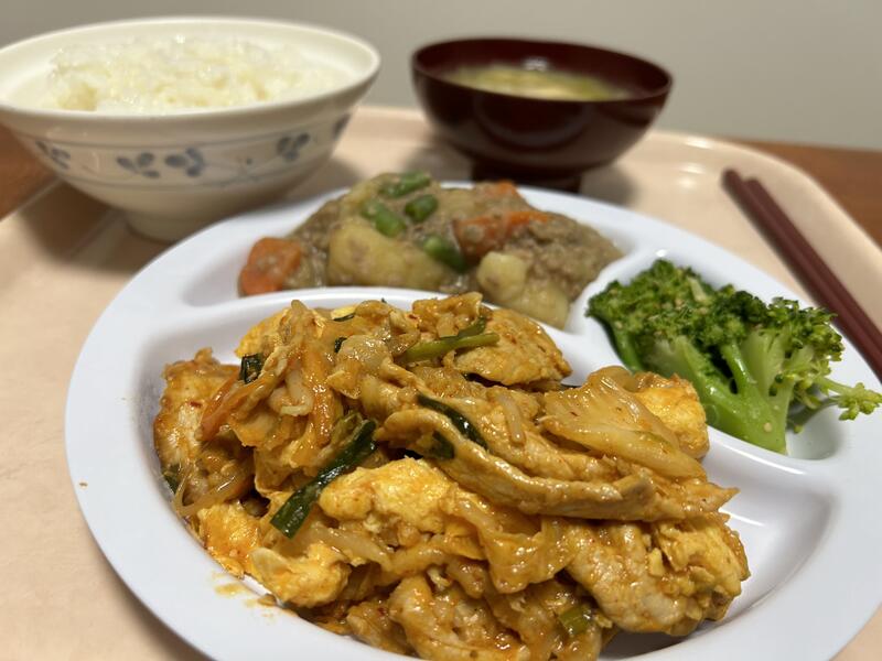 今日のメニューは、「豚肉キムチ炒め」、「じゃがいもそぼろ煮」、「ブロッコリー和え」キャベツ・油揚げの「味噌汁」でした。今日もおいしくいただきました。