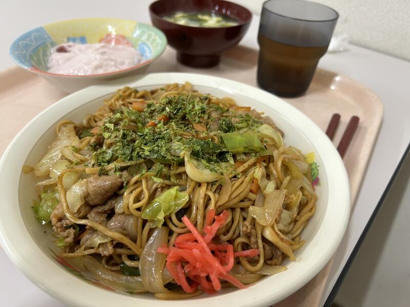 今日のメニューは、「焼きそば」、豆腐・ワカメ・玉子の「スープ」、デザートの「フルーチェ」でした。今日もおいしくいただきました。