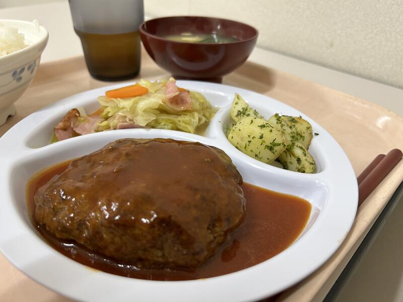 今日のメニューは、「ハンバーグ」、「キャベツベーコン煮」、「ポテト和え」、小松菜・玉子の「味噌汁」でした。今日もおいしくいただきました。