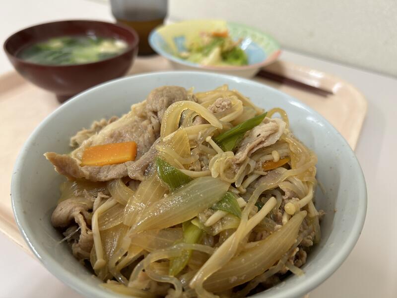 今日のメニューは、「すき煮丼」、「キャベツゴマ和え」、小松菜・豆腐・玉ネギの「味噌汁」でした。今週もおいしくいただきました。