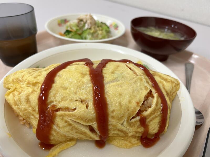 今日のメニューは、「オムライス」、「サラダ」、白菜・玉ネギの「スープ」でした。