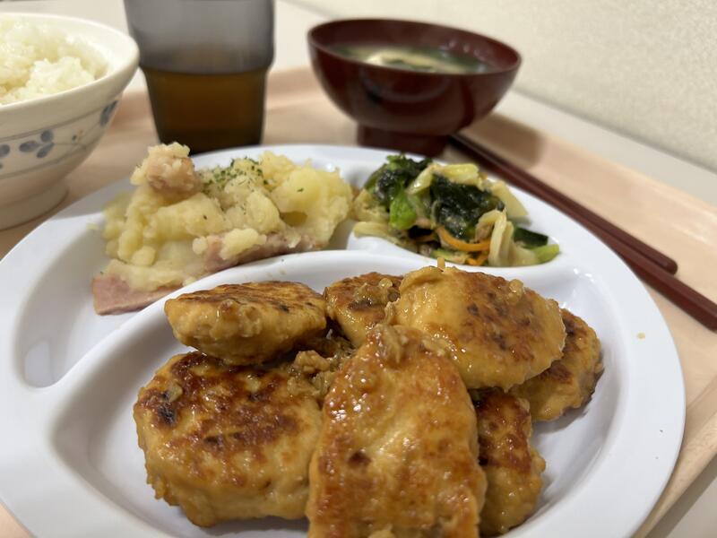 今のメニューは、「鶏団子照り煮」、「野菜炒め」、「じゃがいもツナサラダ」、白菜・油揚げの「味噌汁」でした。今日もおいしくいただきました。