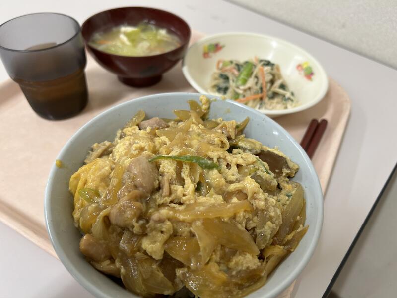 今のメニューは、「親子丼」、「華風和え」、小松菜・豆腐の「味噌汁」でした。