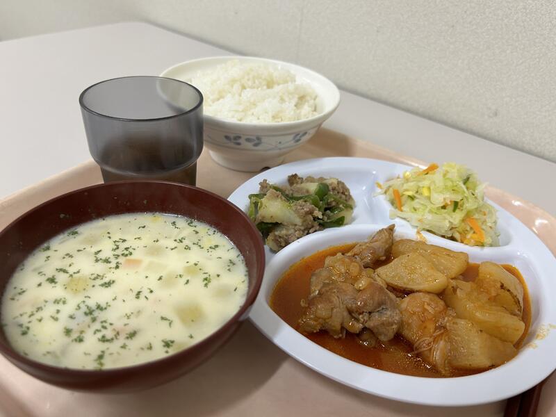 今日のメニューは、「チキンと大根のトマト煮込み」、「じゃがいもそぼろ炒め」、「キャベツサラダ」、「クラムチャウダー」でした。今日もおいしくいただきました。
