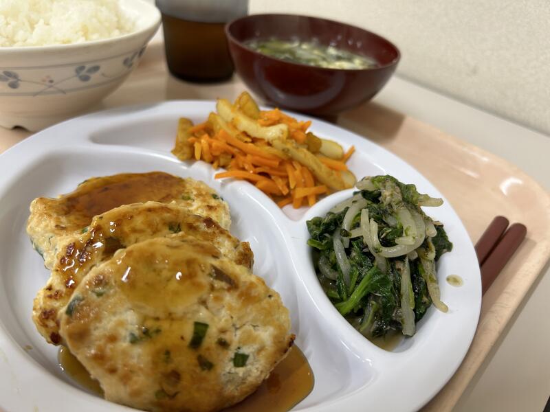 今日のメニューは、「豆腐つくね」、「人参の塩きんぴら」、「ほうれん草のり和え」、玉ネギ・玉子・わかめの「味噌汁」でした。今日もおいしくいただきました。