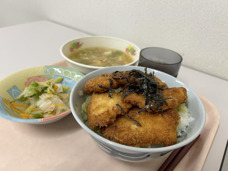 今日のメニューは、「タレカツ丼」、「白菜のおひたし」、「けんちん汁」でした。