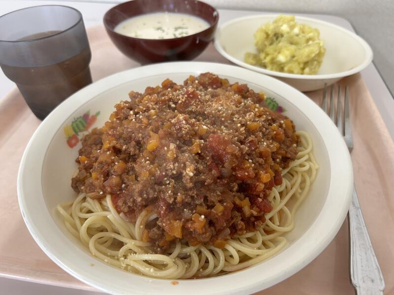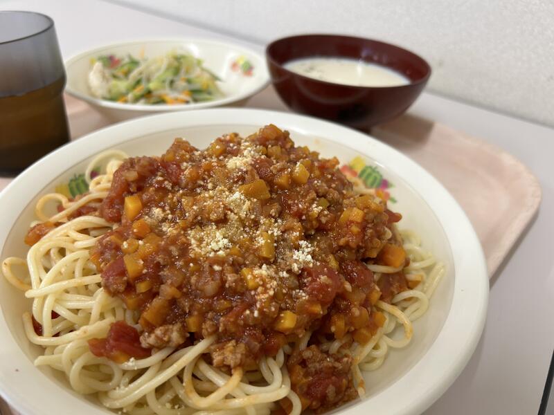 今日のメニューは、「スパゲティミートソース」、「ササミのさっぱりサラダ」、「コーンスープ」でした。今日もおいしくいただきました。