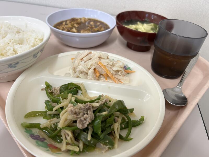 今日のメニューは、「麻婆豆腐」、「チンジャオロース」、「大根サラダ」、「中華スープ」でした。今日もおいしくいただきました。