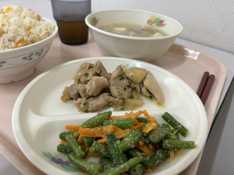 今日のメニューは、「きつねごはん」、「鶏肉のしょうゆマヨ炒め」、「インゲンのゴマ和え」、「豚汁」でした。今日もおいしくいただきました。
