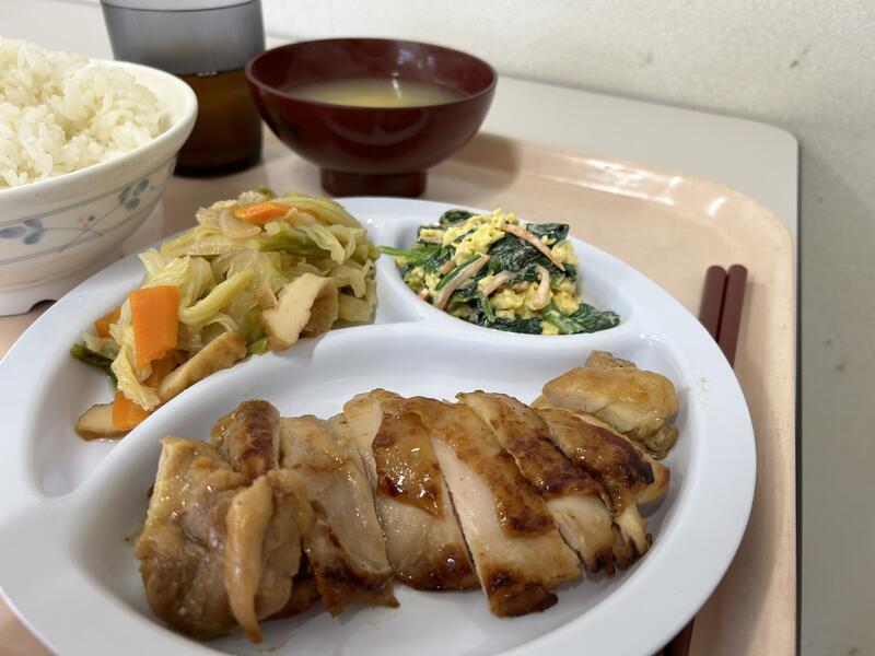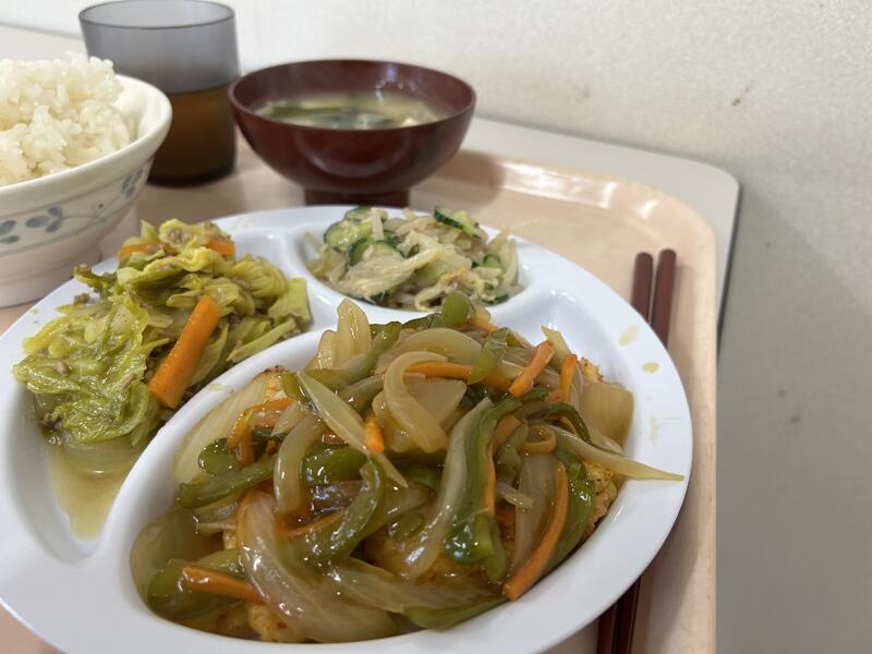 今日のメニューは、「鶏肉ネギソース」、「キャベツベーコン煮」、ワカメ・豆腐・油揚げ・玉ネギが入った「味噌汁」でした。今日もおいしくいただきました。