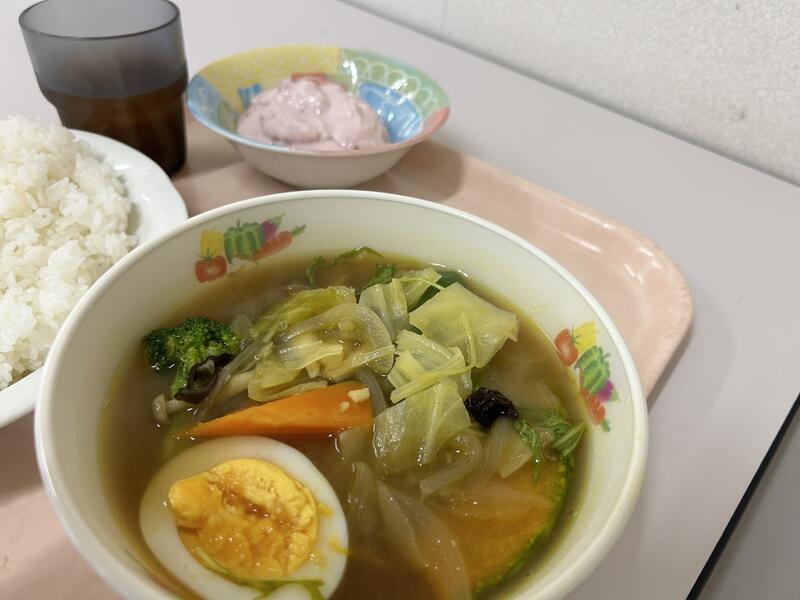 今日のメニューは、「キーマカレー」、「コールスローサラダ」、小松菜・玉子が入った「スープ」でした。今日もおいしくいただきました。