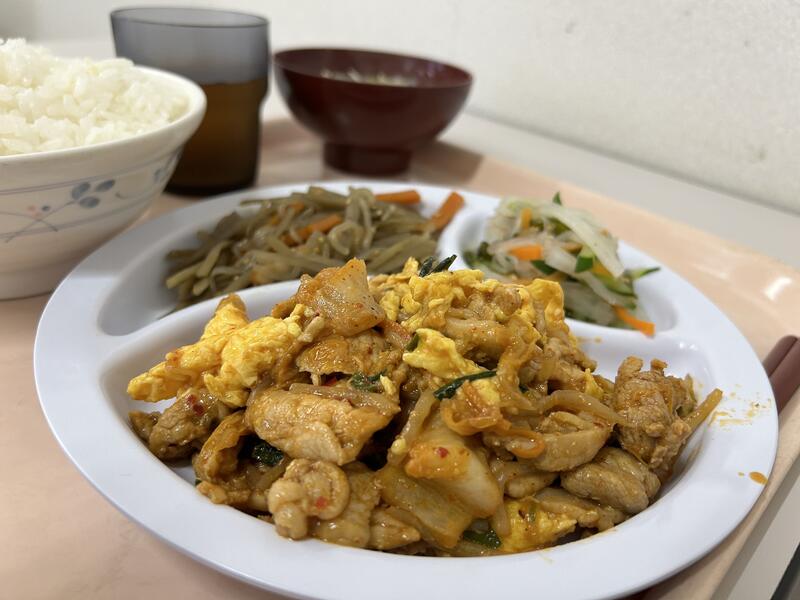 今日のメニューは、「豚キムチ炒め」、「きんぴらごぼう」、「大根和え」、玉ネギ・キャベツ・油揚げの「味噌汁」でした。今日もおいしくいただきました。