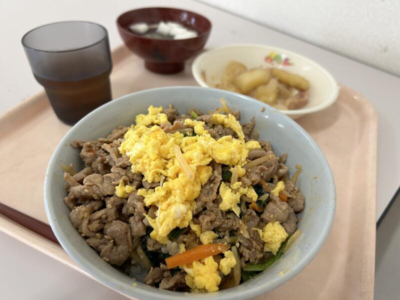 今日のメニューは、「すき煮丼」、「大根和え」、小松菜・玉子が入った「味噌汁」でした。今週もおいしくいただきました。