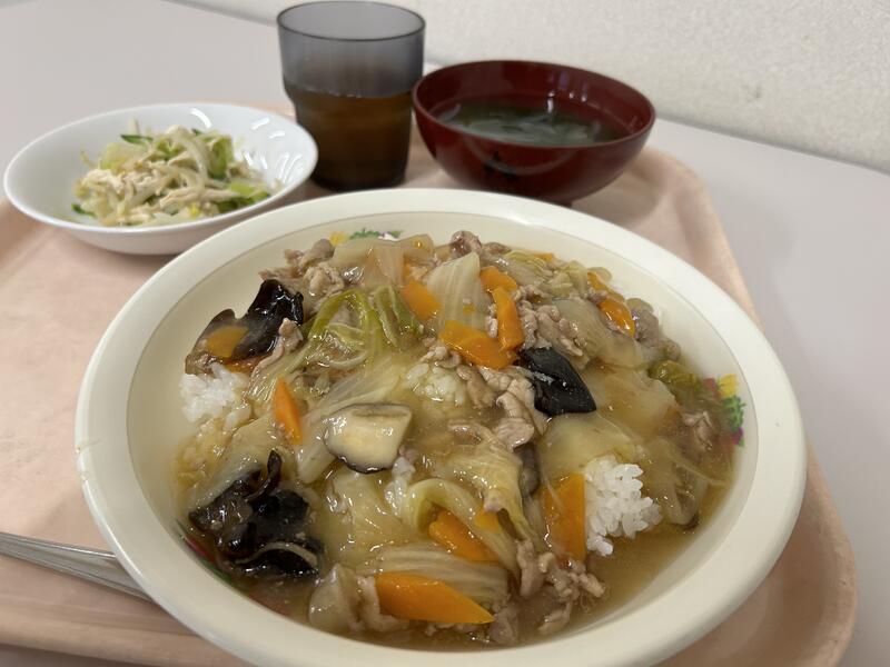 今日のメニューは、「中華丼」、「もやしとハムのサラダ」、ワカメと玉ネギの「スープ」でした。今週もおいしくいただきました。