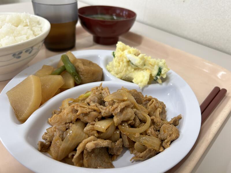 今日のメニューは、「ポークチャップ」、「大根とがんもの煮物」、「ポテトサラダ」、キャベツ・油揚げが入った「味噌汁」でした。今日もおいしくいただきました。