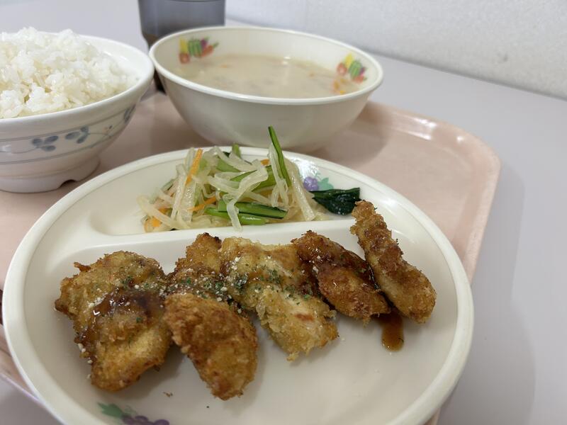 今日のメニューは、「鶏天甘酢あん」、「キャベツカレー煮」、「もやしツナ和え」、豆腐・えのき・ワカメの「味噌汁」でした。今日もおいしくいただきました。