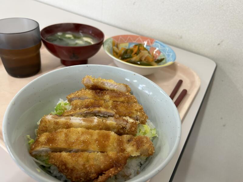 今日のメニューは、「ソースカツ丼」、「ピーマンと人参のきんぴら」、豆腐・ワカメ・長ネギが入った「味噌汁」でした。今週もおいしくいただきました。