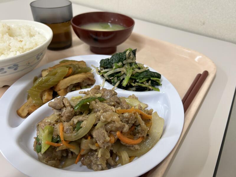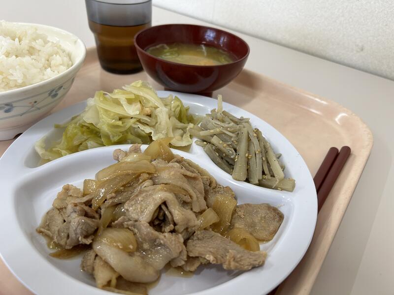 今日のメニューは、「豚の生姜焼き」、「キャベツの煮びたし」、「たたきごぼう」、かぼちゃ・長ネギの「味噌汁」でした。今日もおいしくいただきました。