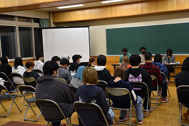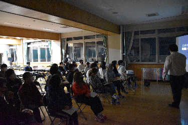 対面式では、生徒会執行部と先生方が動画で様々なものにチャレンジし、その答えを生徒が当てるというゲームでした。生徒は皆楽しそうに映像を見て、まわりの人と相談しながら解答を考えている様子が見られました。